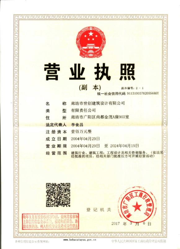 廊坊市世創(chuàng)建筑設計有限公司,原為廊坊市規(guī)劃設計院建筑工程設計所。成立于1997年,多年來本公司在社會各界人士的關心、支持下,不斷發(fā)展壯大。自2006年3月1日起具有國家建設部核準的建筑工程乙級設計證書,證書編號為:A213006026。企業(yè)法人營業(yè)執(zhí)照,注冊號:131003000011148 我公司自創(chuàng)建以來完成各類工業(yè)與民用建筑設計、咨詢項目共有三百五十多項,建筑面積近三百萬平方米,工程所在地涵蓋廊坊、天津、北京等地區(qū)。并有...